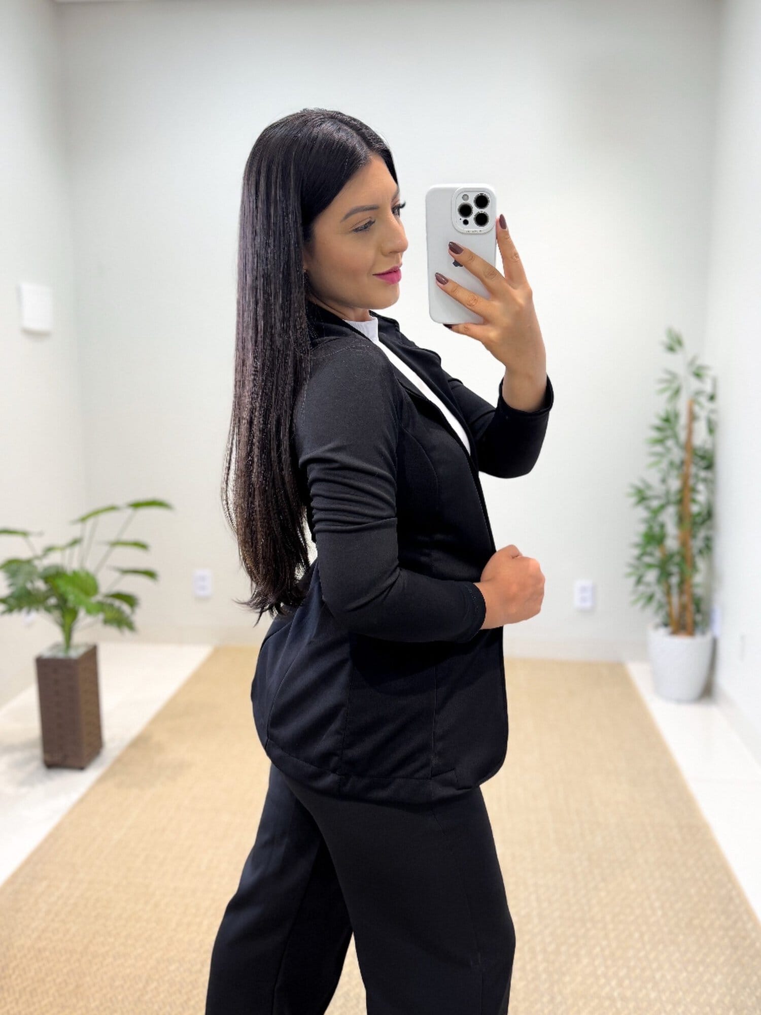 Blazer em neoprene, elegante e sofisticado, ideal para sobreposições. Possui comprimento alongado, que traz ainda mais elegância.