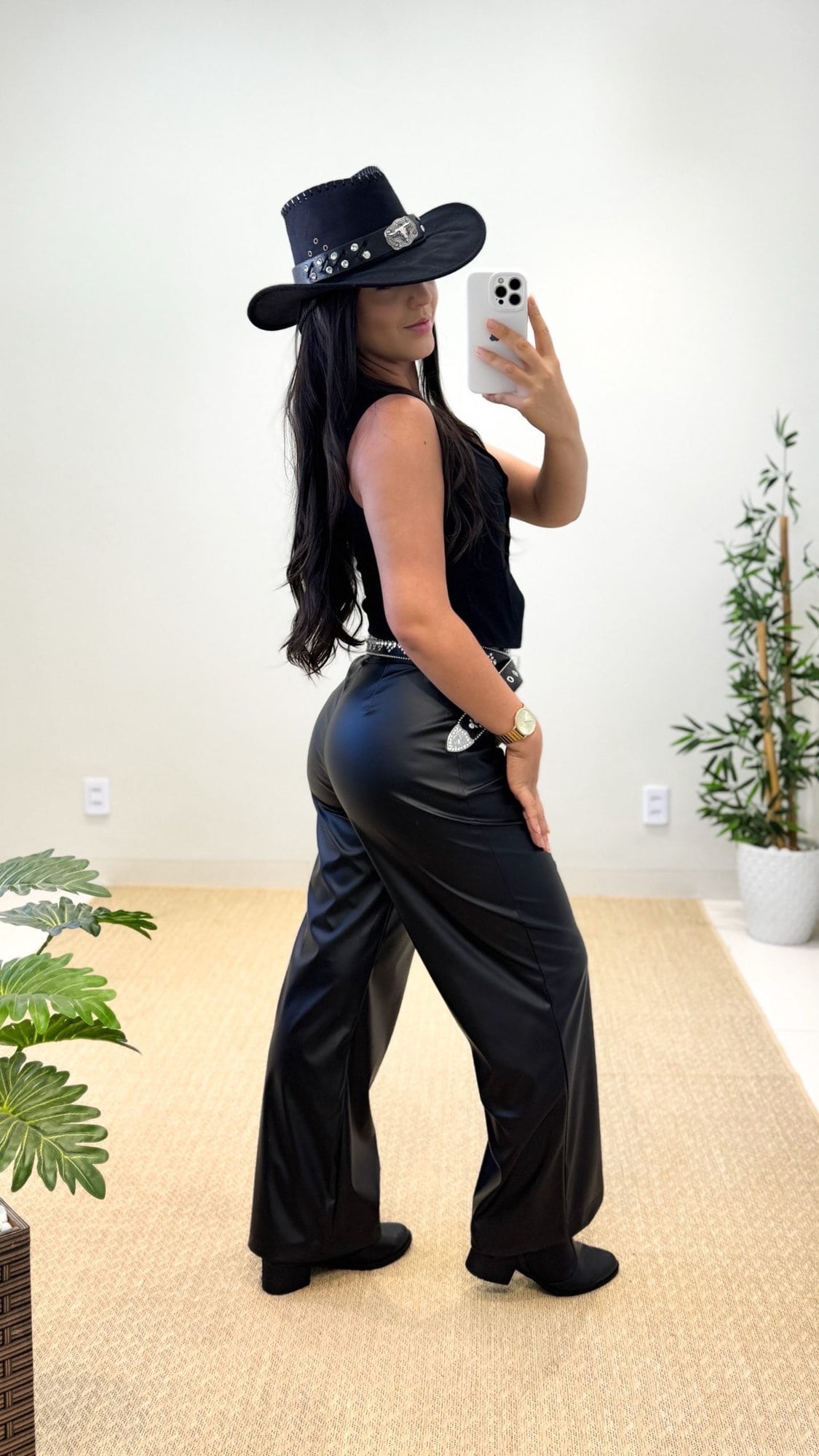 Calça courino flare, é um modelo confortável e estiloso.
