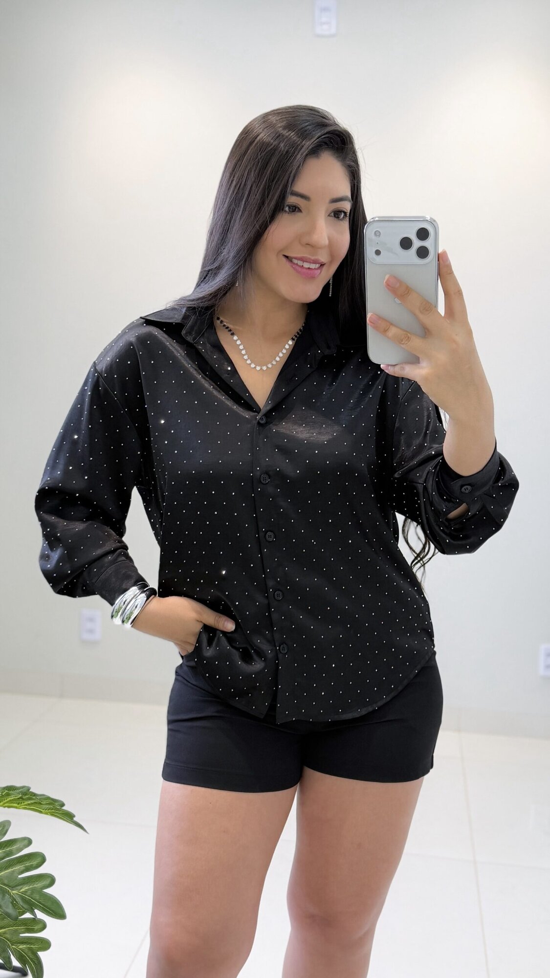 Camisa indispensável, com strass que ilumina a peça na medida certa. Em cetim, garante caimento impecável e ajuste perfeito, com botões frontais e nos punhos.