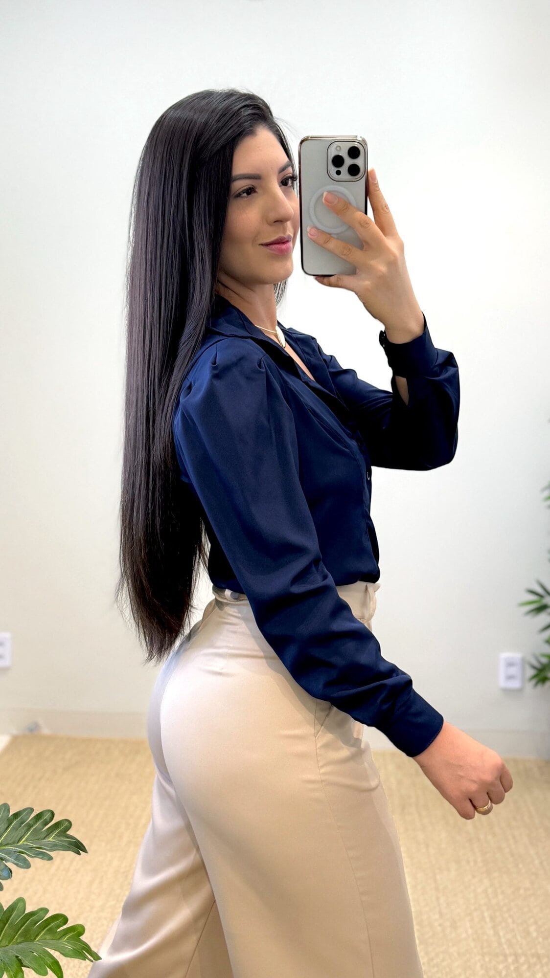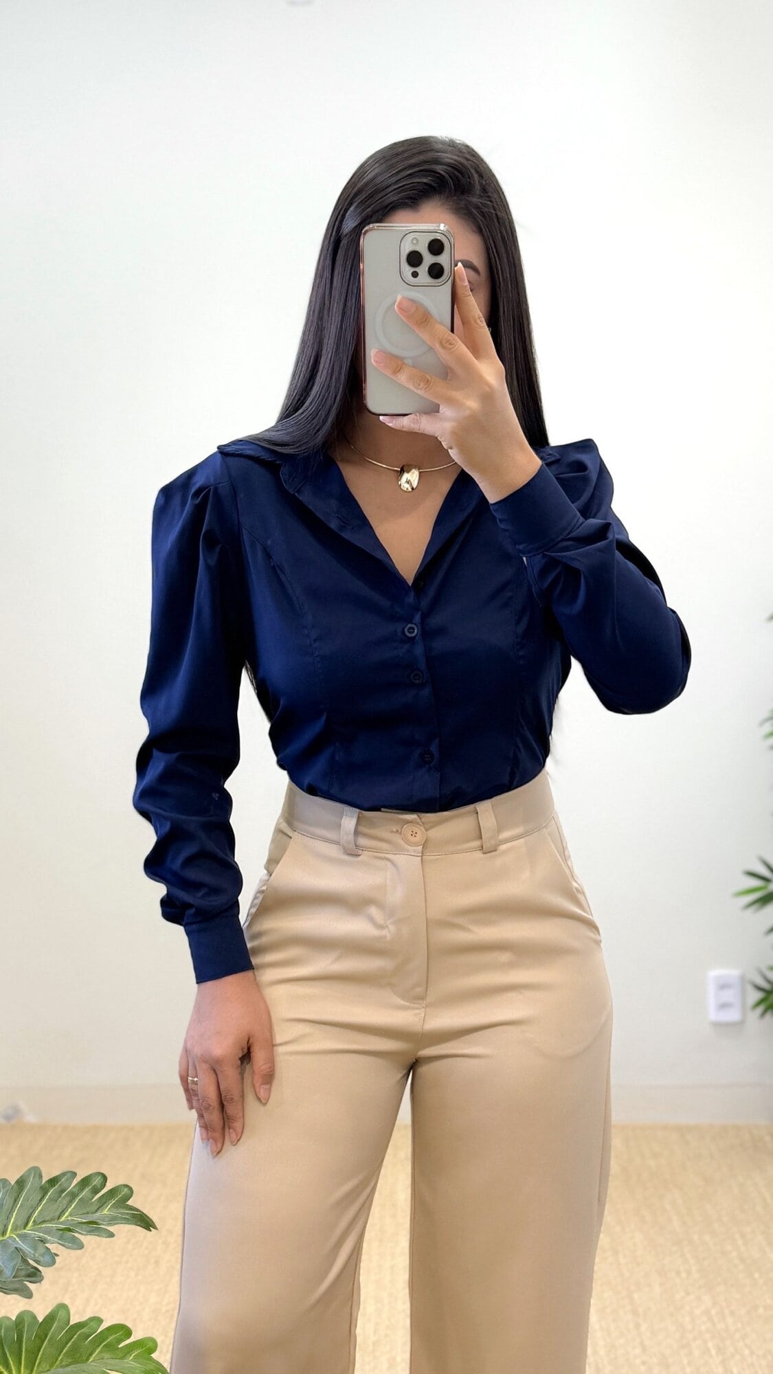 Camisa moderna que transita entre o formal e o casual de manga princesa, sendo uma peça que permite infinitas combinações.