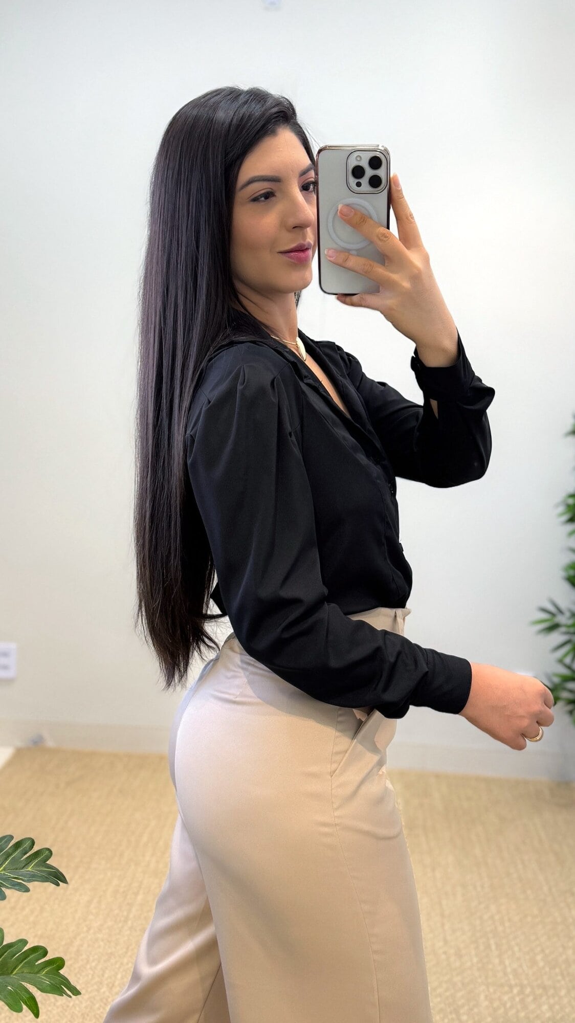 Camisa moderna que transita entre o formal e o casual de manga princesa, sendo uma peça que permite infinitas combinações.