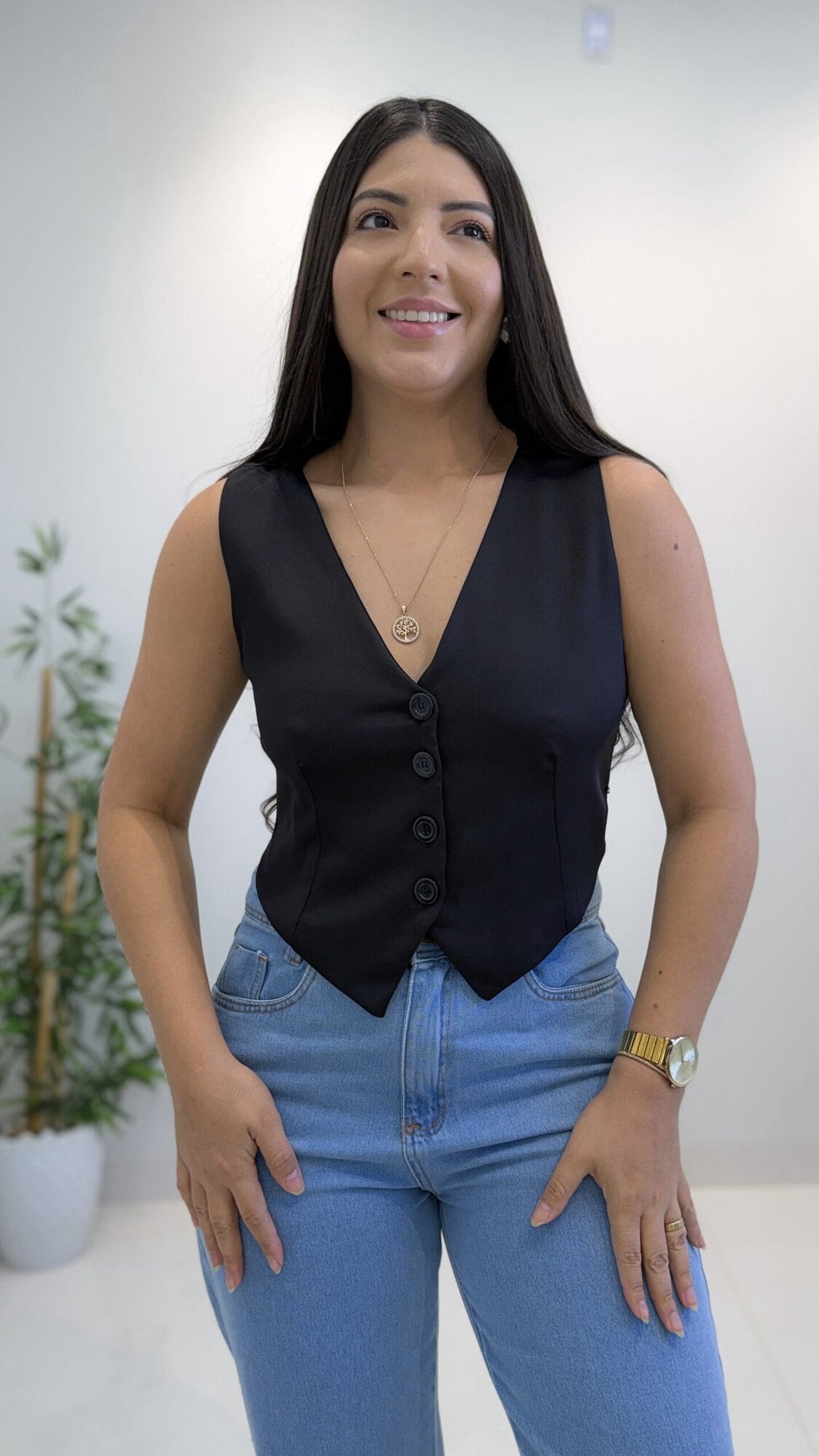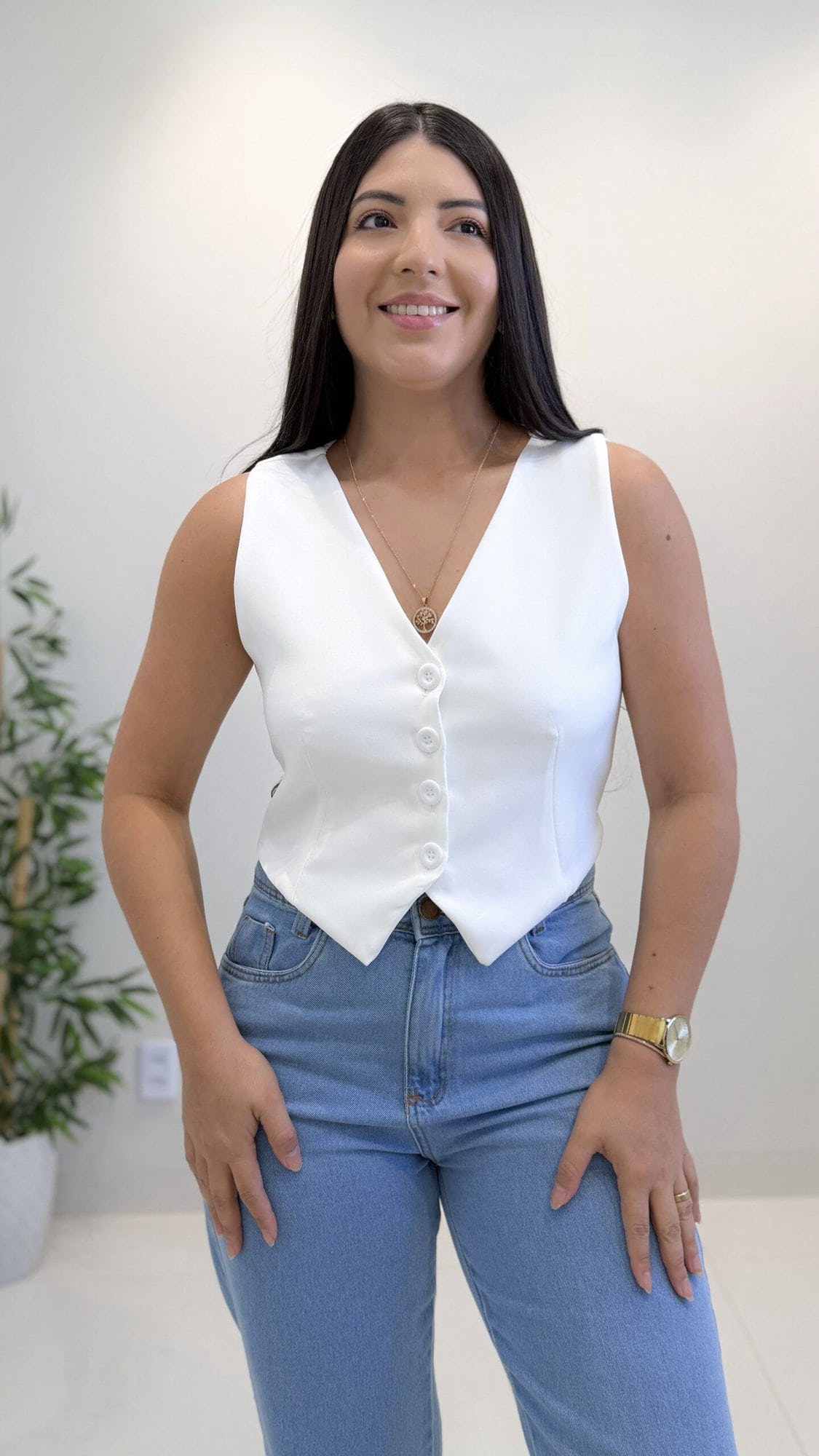 Colete em crepe com caimento impecável e recorte que valoriza a produção. Uma peça versátil que transforma o básico em um look sofisticado.