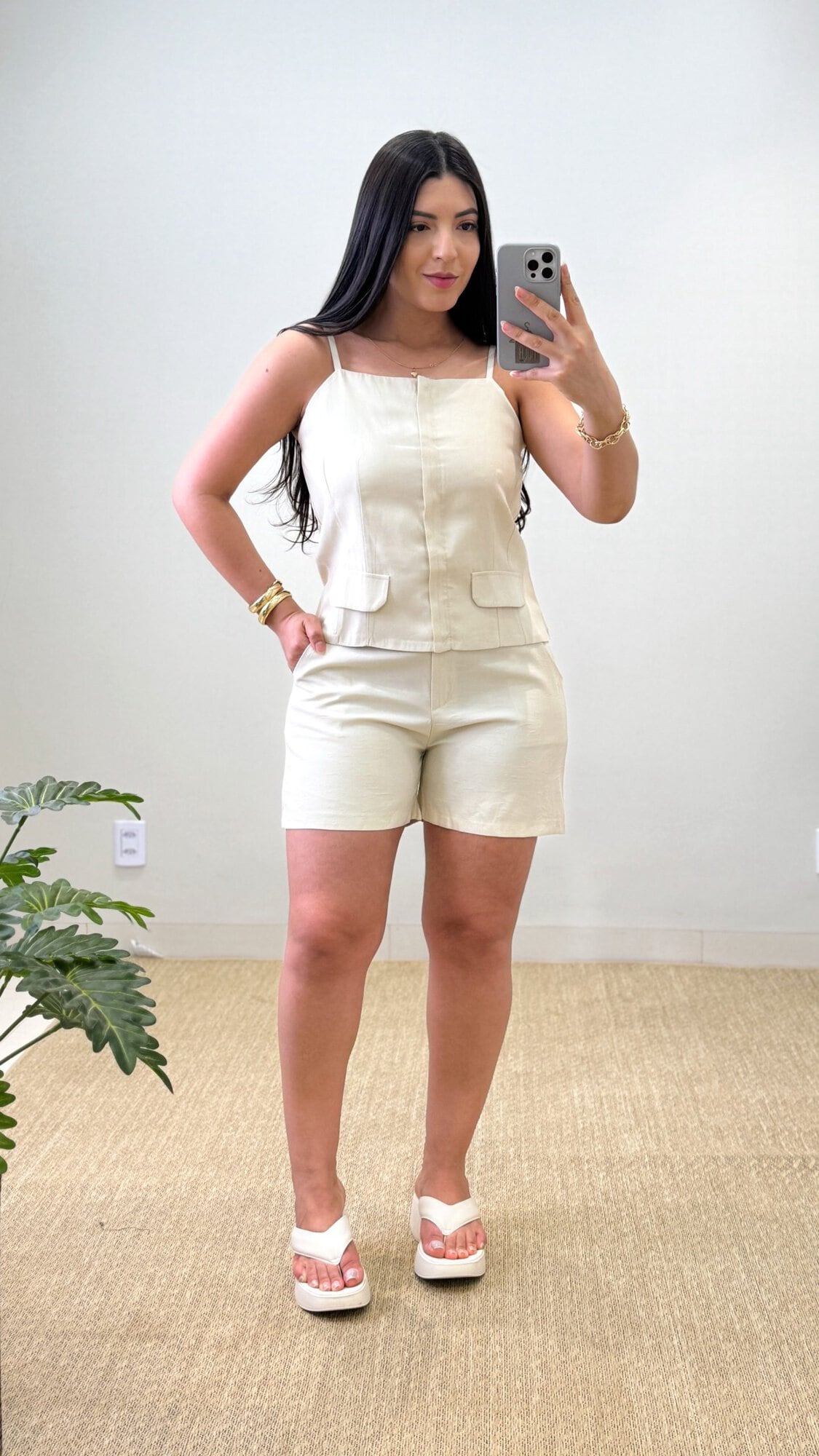 Conjunto de Blusa + Short, look completo e com versatilidade para arrasar em várias ocasiões. Confeccionado no tecido Marrant, a blusa não possui bojo e o fechamento é com zíper frontal.