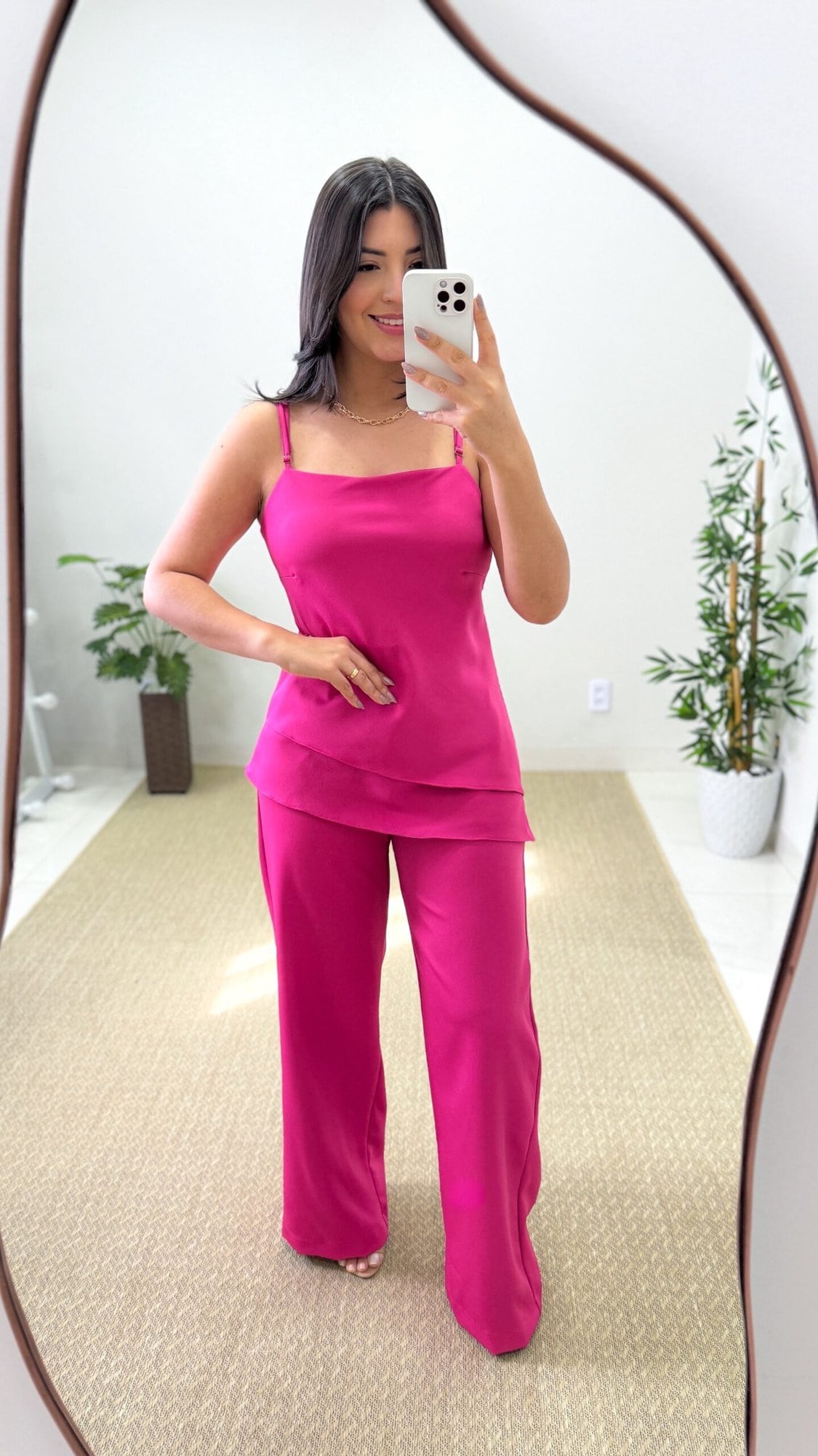 O melhor conjunto para quem busca um look elegante e atual. A blusa assimétrica é moderna e descolada, suas irregularidades trazem elegância e estilo ao conjunto, enquanto a calça pantalona tem sido uma das maiores tendências dos últimos tempos, já que tende a apresentar a cintura mais alta e promovendo conforto na hora de usar. Confeccionado em Crepe Alfaiataria, esse conjunto traz um tecido de alta qualidade e seu caimento é impecável. O conjunto perfeito para todas as ocasiões.
