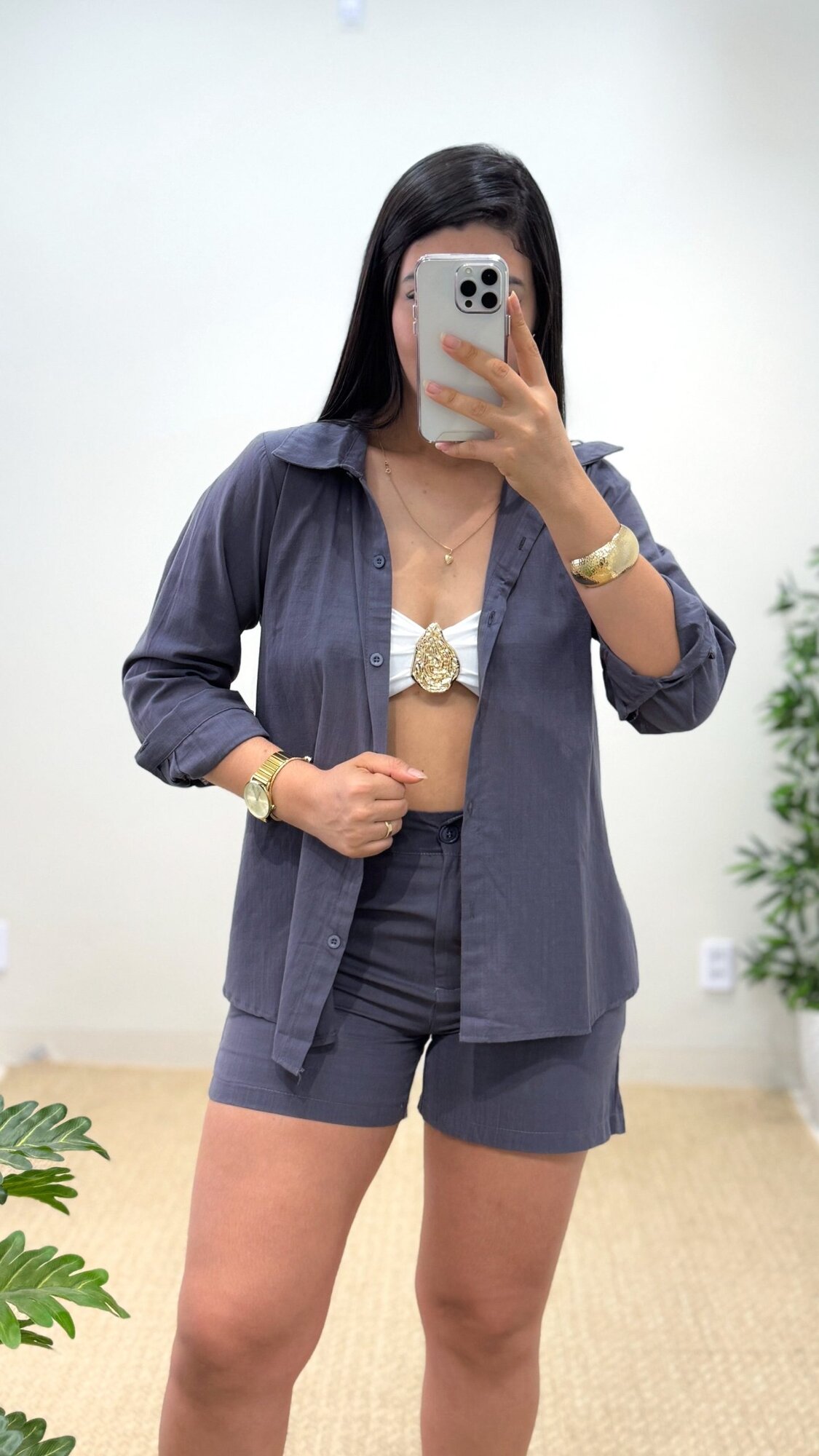 Conjunto social de short e camisa, é um modelo elegante e versátil que possibilita compor looks separadamente e arrasar em diversas ocasiões. (O short possui elástico na parte detrás do cós)