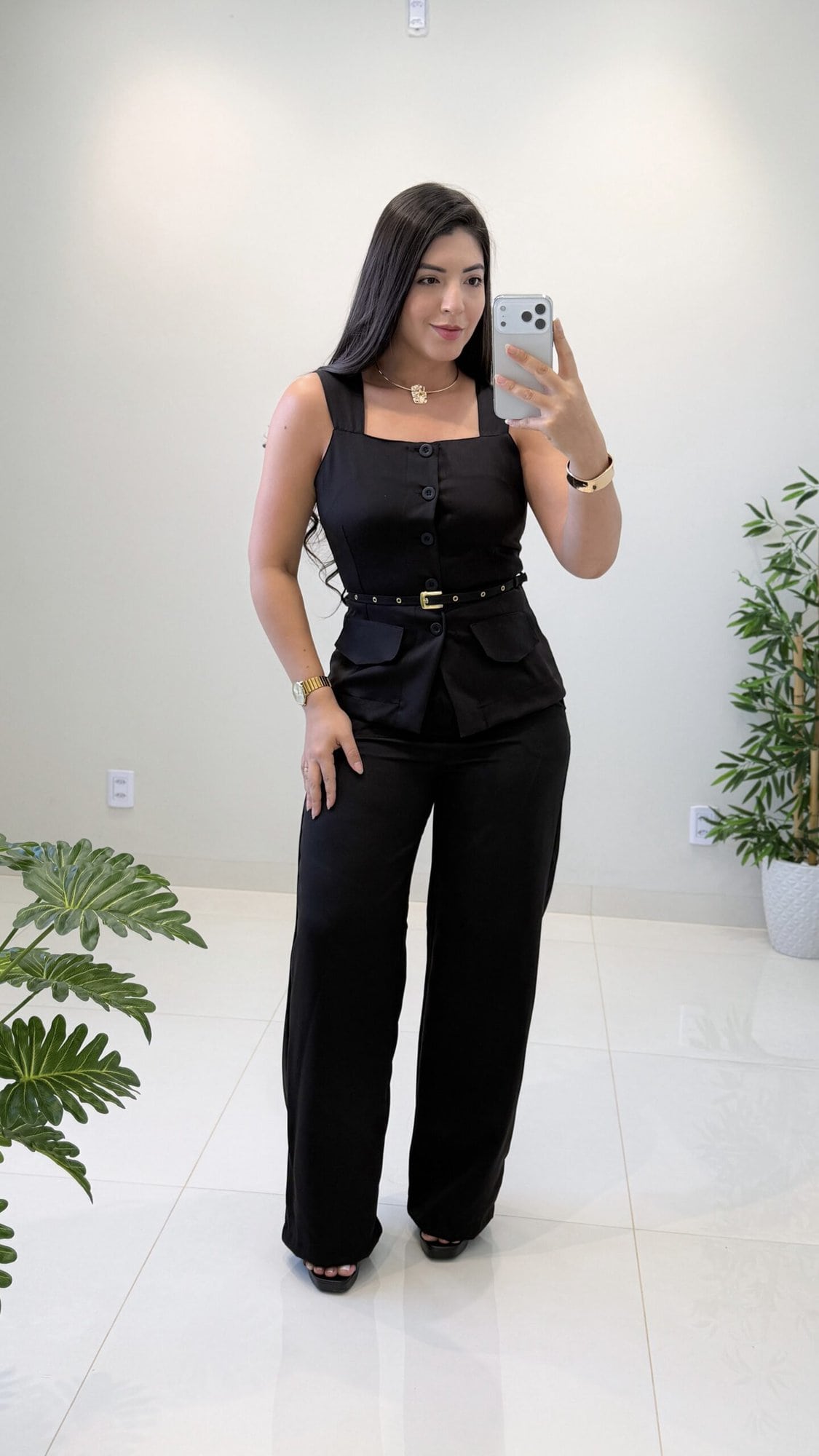 Conjunto em crepe alfaiataria importado, com caimento impecável e acabamento refinado. O colete com cinto traz charme extra, enquanto a calça de cintura alta alonga e valoriza a produção..