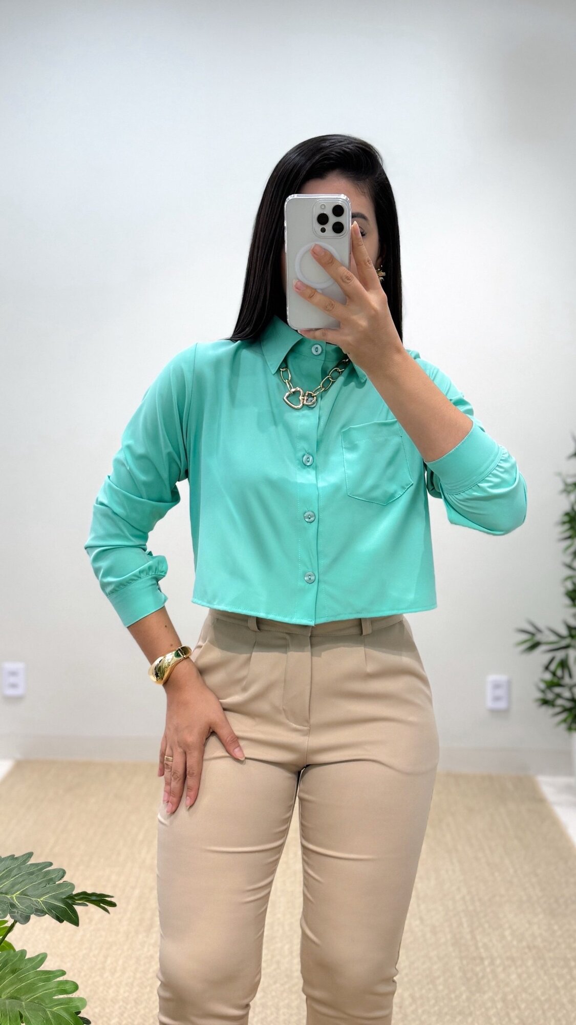 Cropped camisa social de manga comprida e botões, confeccionada no crepe. Estilosa e muito confortável para as suas composições do dia a dia.