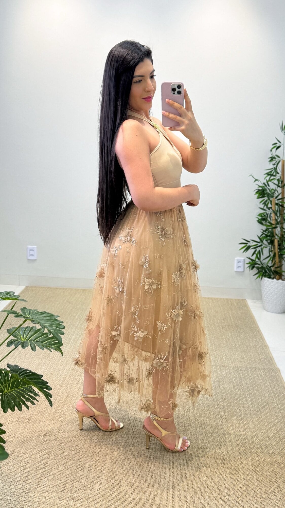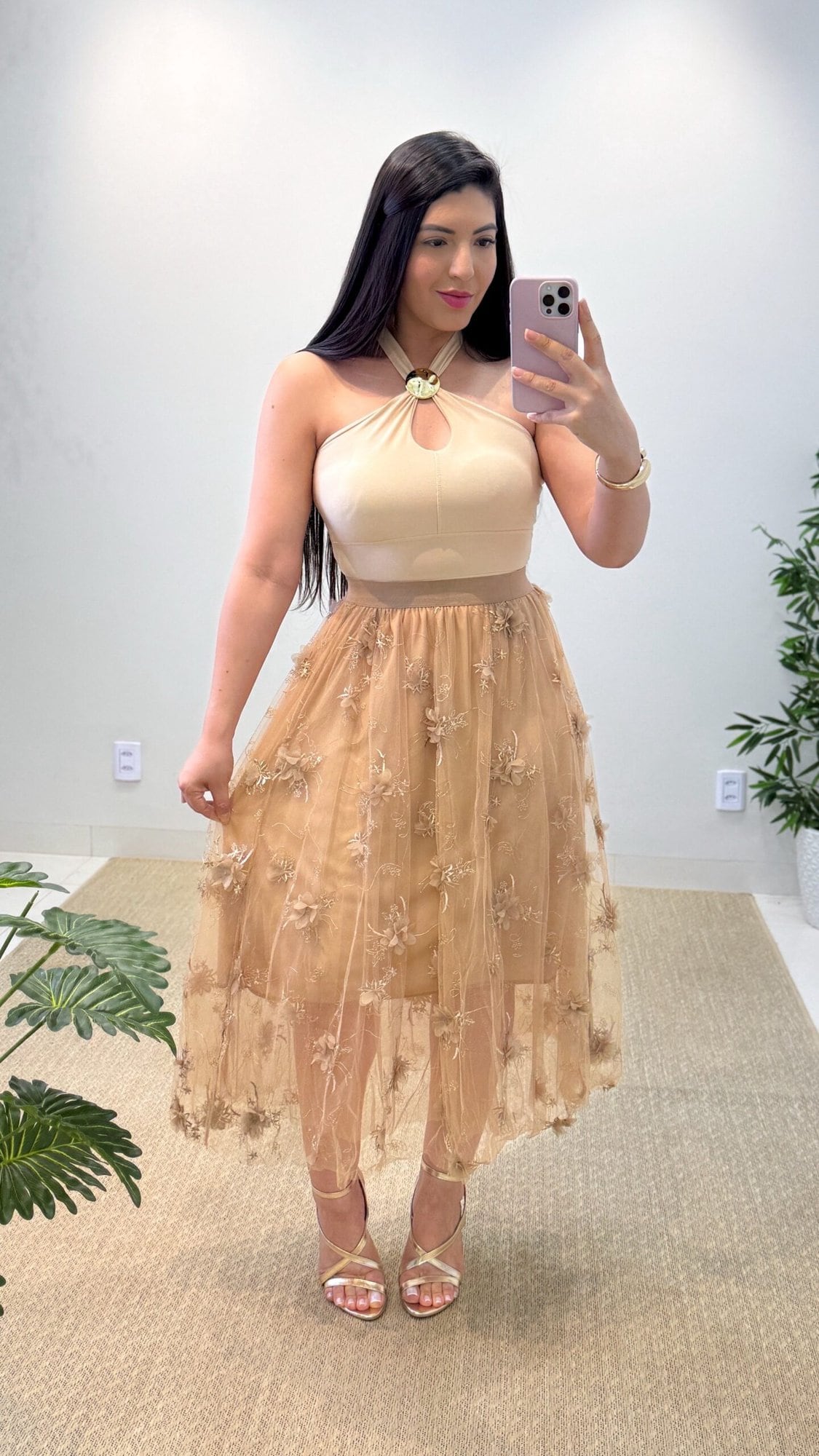 Saia midi de tule que veio para te dar conforto e elegância, se adequa na cintura, com detalhes delicados de flores para você arrasar nos seus looks.