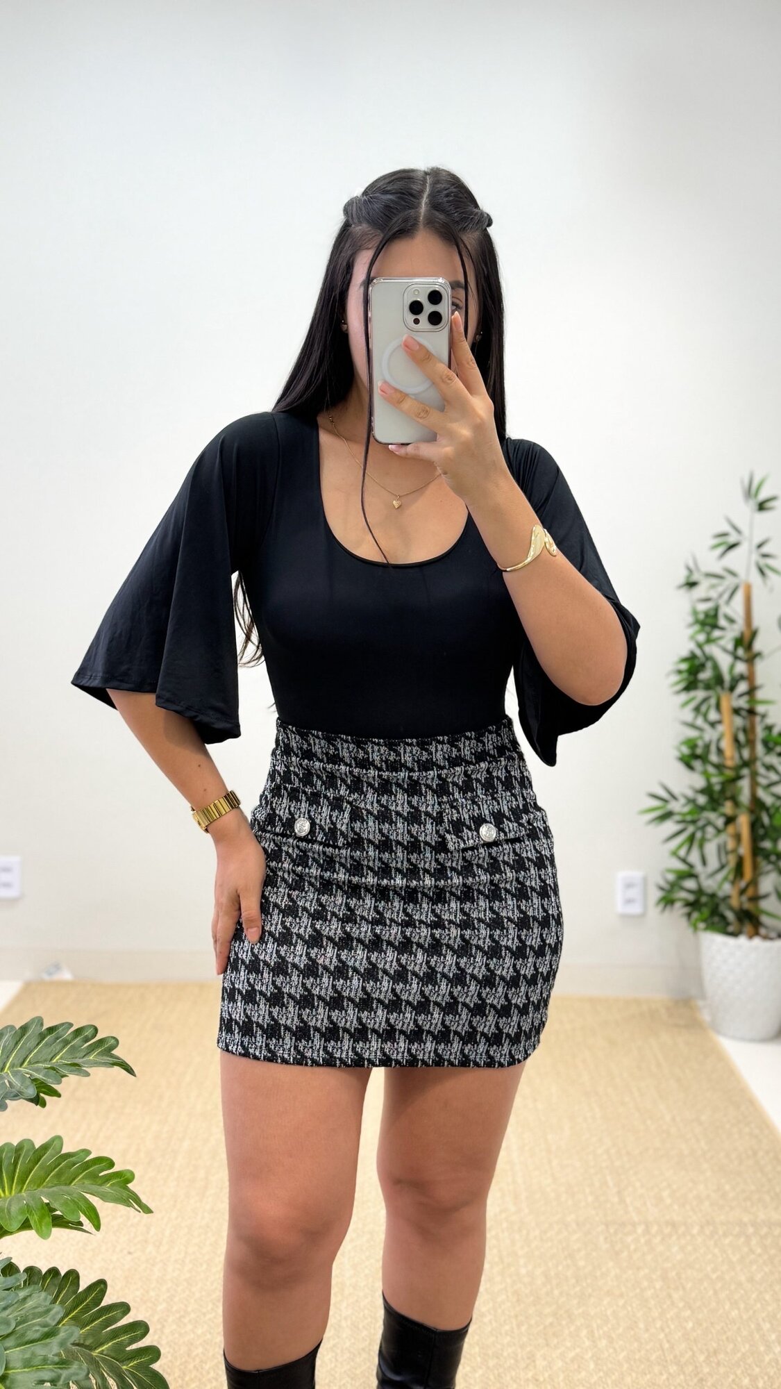 Saia confeccionado na malha jacquard, é encorpado, de aspecto luxuoso e imponente trazendo sofisticação, empoderamento e muita elegância.
