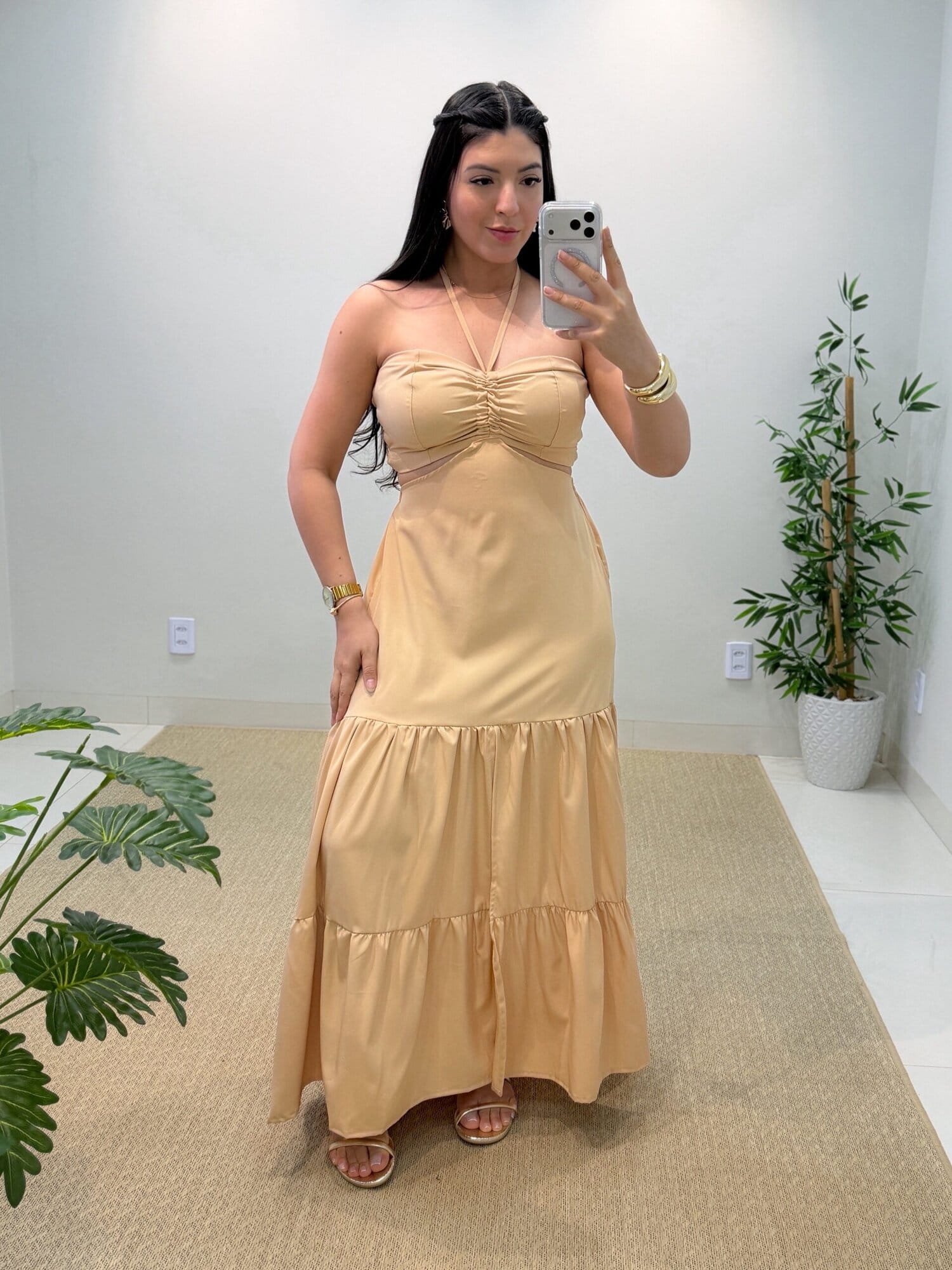 Vestido longo confeccionado no crepinho, com recortes estratégicos.