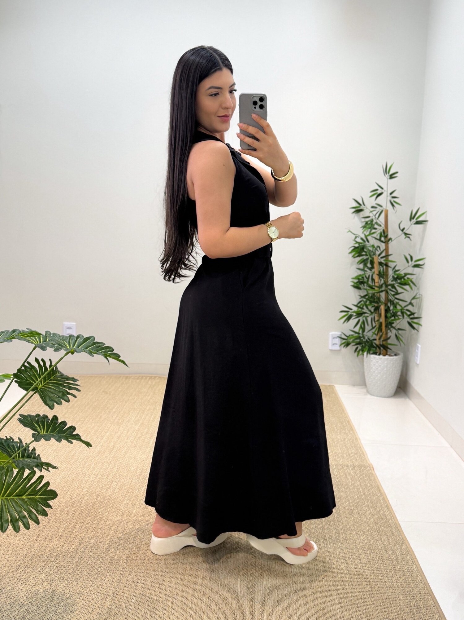 Vestido longo, confeccionado no tecido Dunas. É uma opção social e sofisticada, já possui cinto.