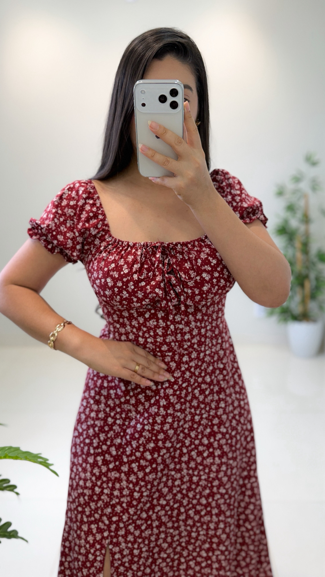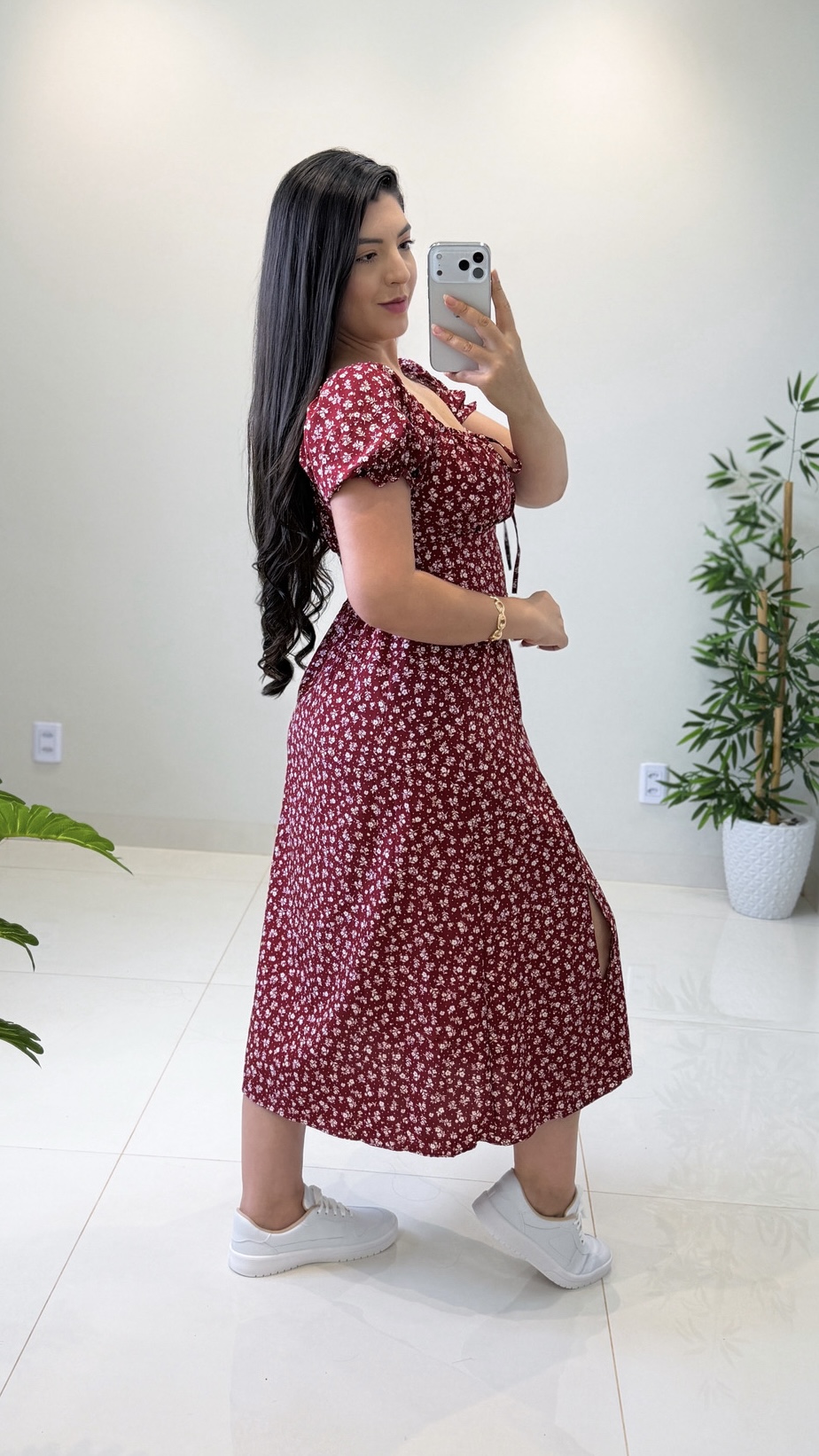 Vestido de comprimento midi com uma fenda bem charmosa na lateral e estampa delicada. Tem ajuste na parte do busto e já possui bojo. O tecido é leve e confortável.