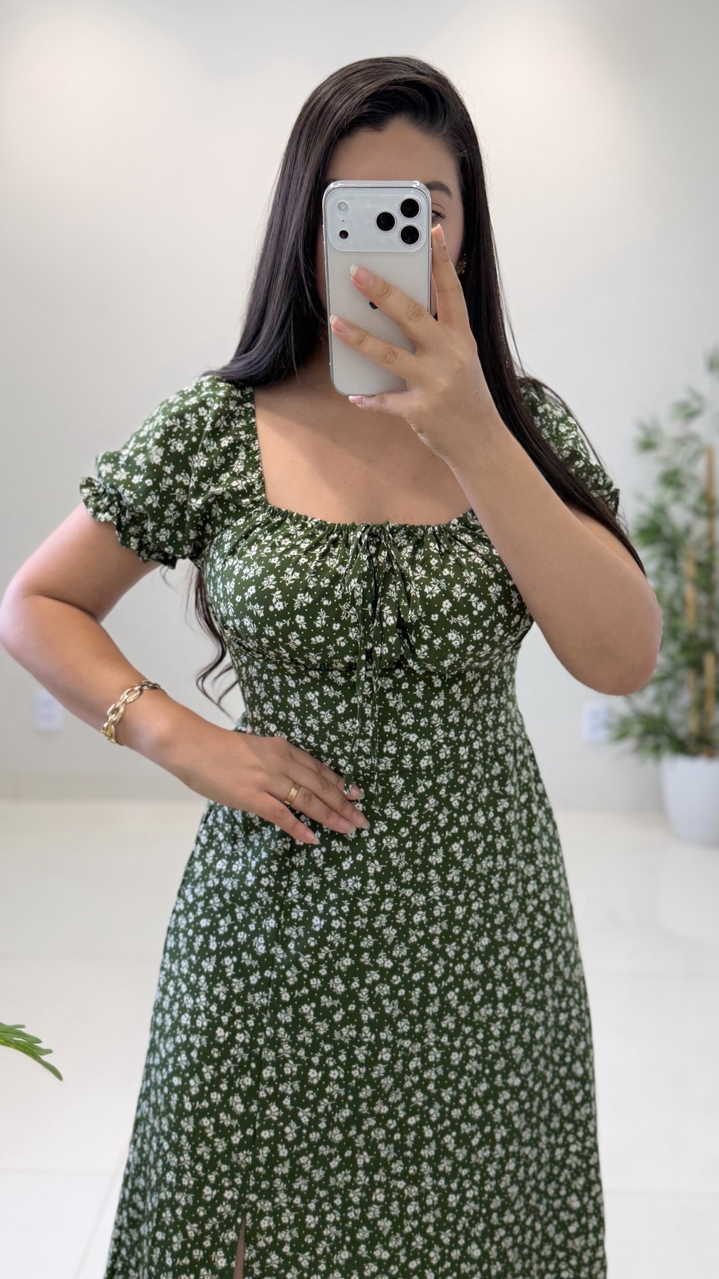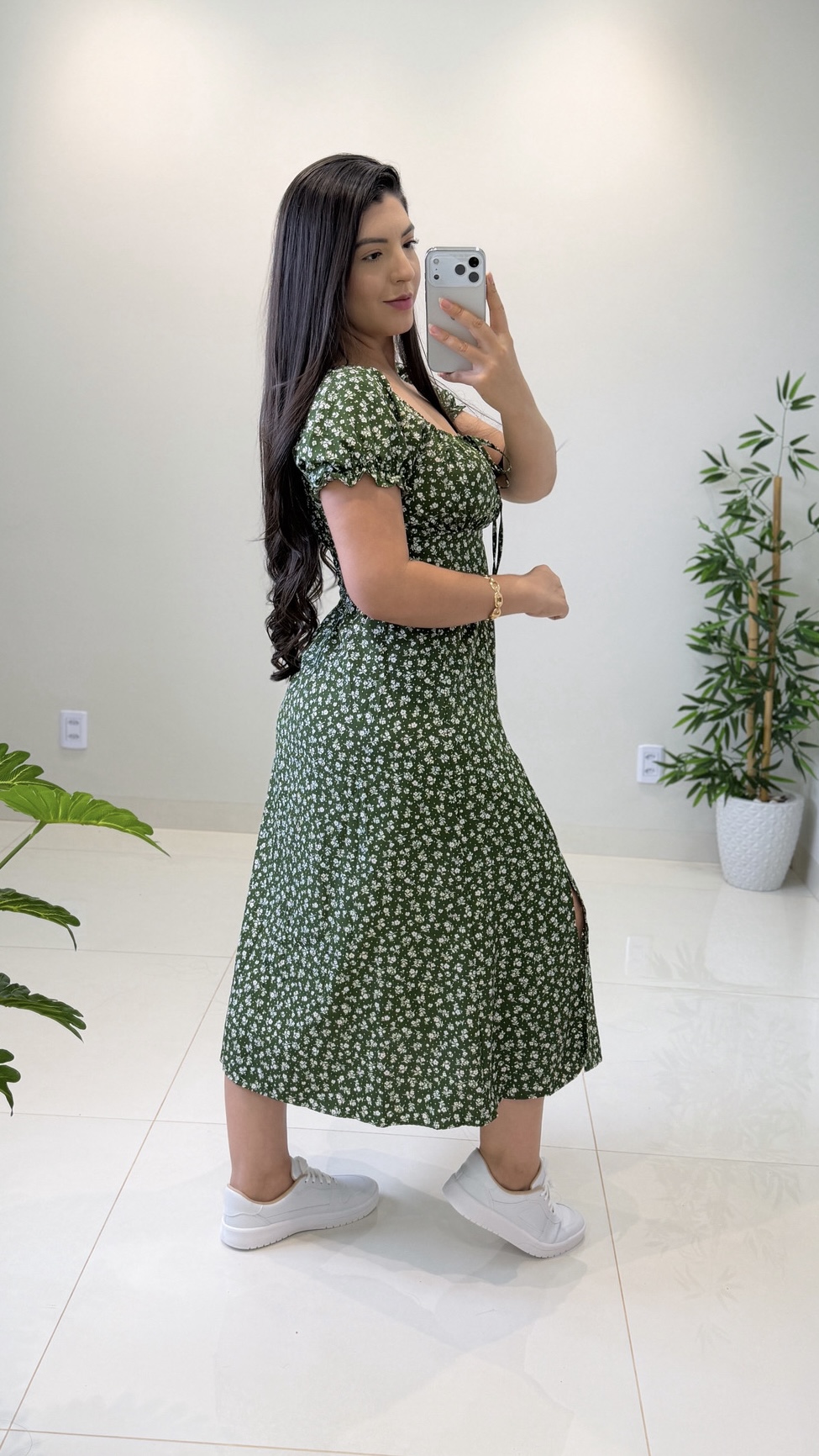 Vestido de comprimento midi com uma fenda bem charmosa na lateral e estampa delicada. Tem ajuste na parte do busto e já possui bojo. O tecido é leve e confortável.