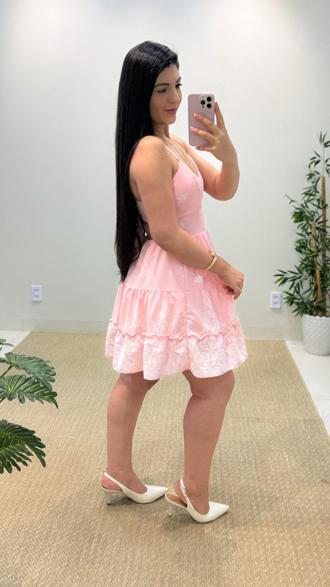 Vestido soltinho, em seu tecido possui bordados de flores bem delicados. Modelinho forrado, com bojo e alça regulável.