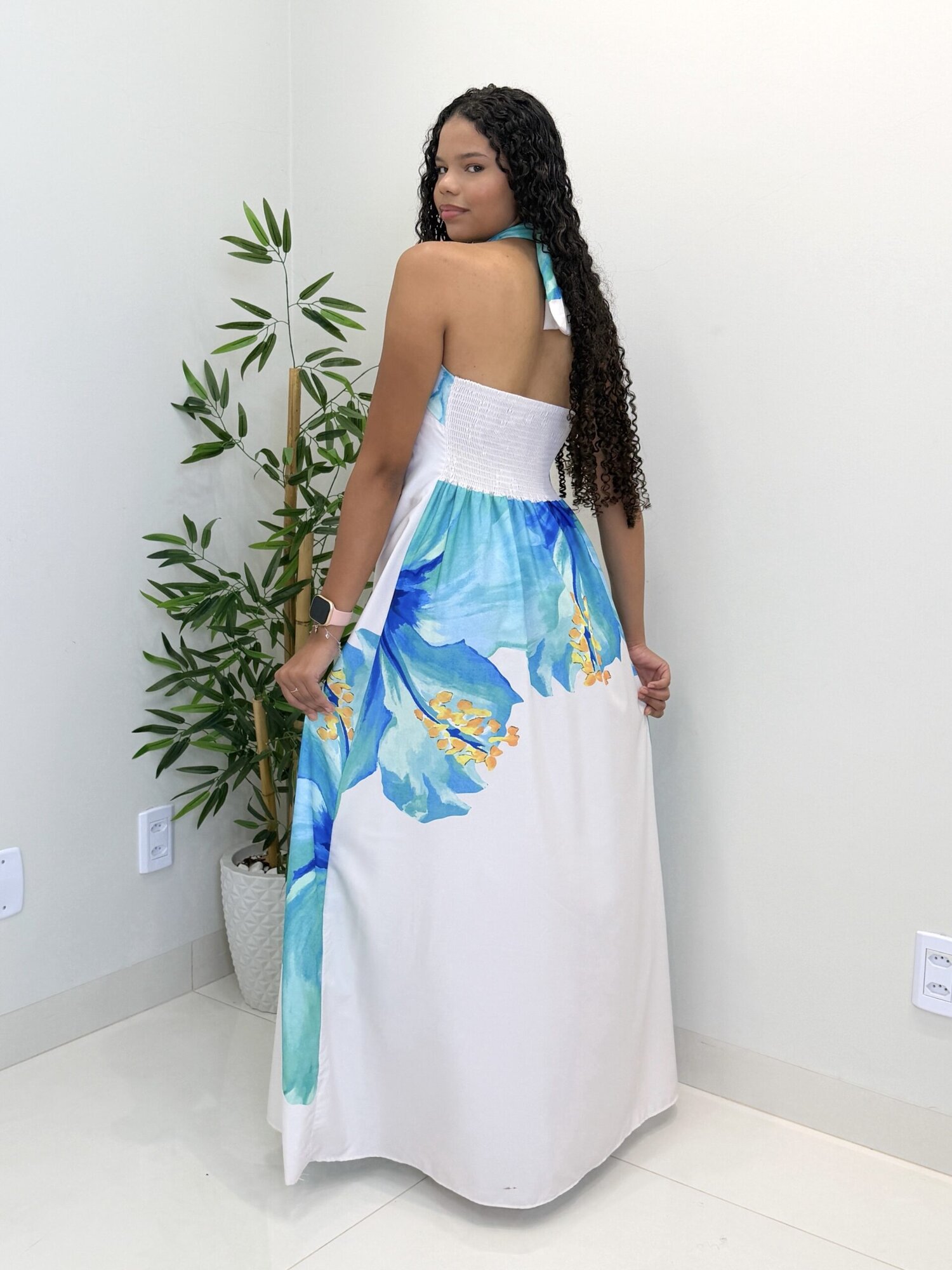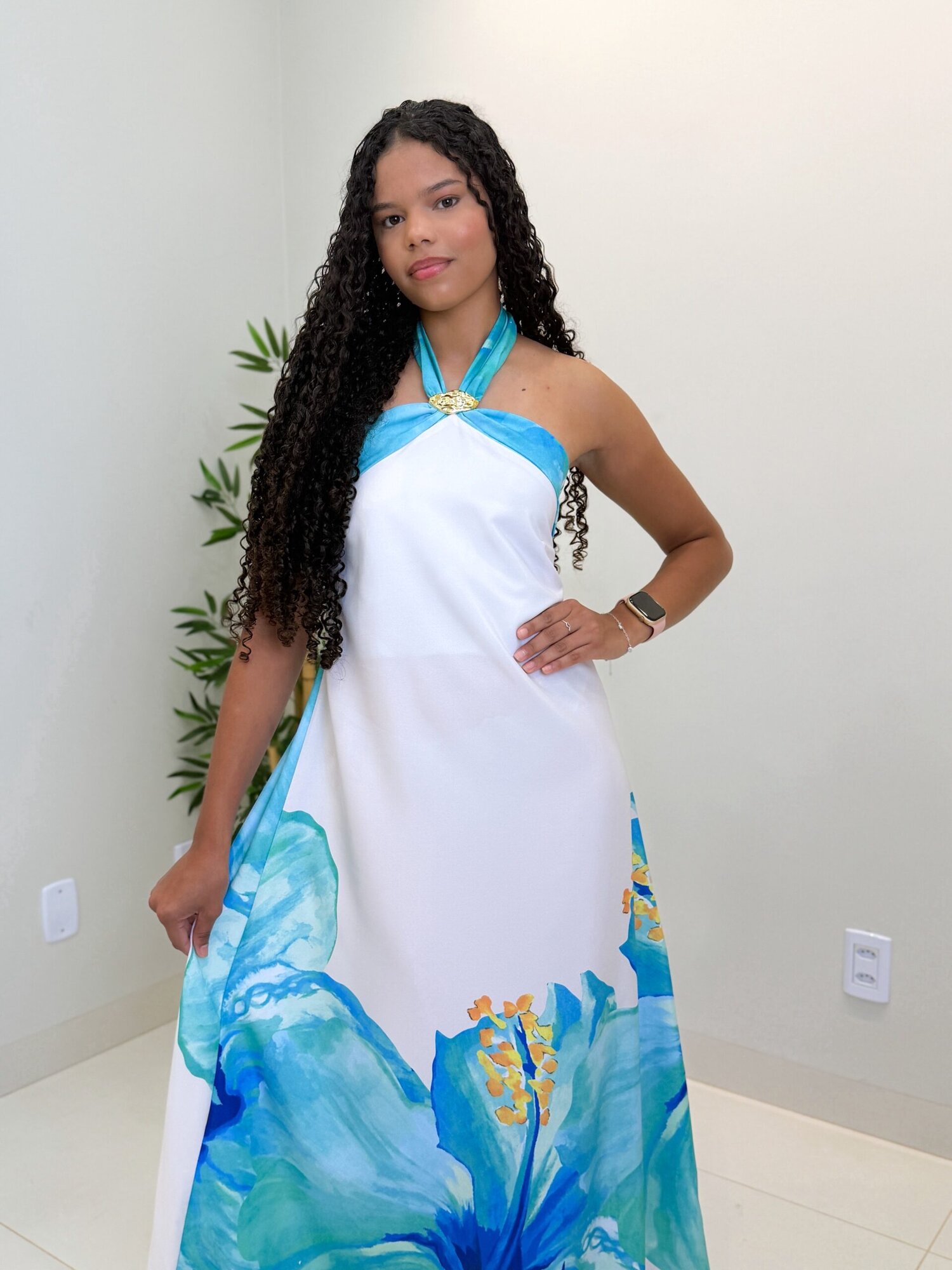 Com modelagem longa e fluida, ele traz leveza e movimento a cada passo. com amarração no pescoço e lastex nas costas, enquanto a estampa marcante deixa o look moderno e sofisticado na medida certa.