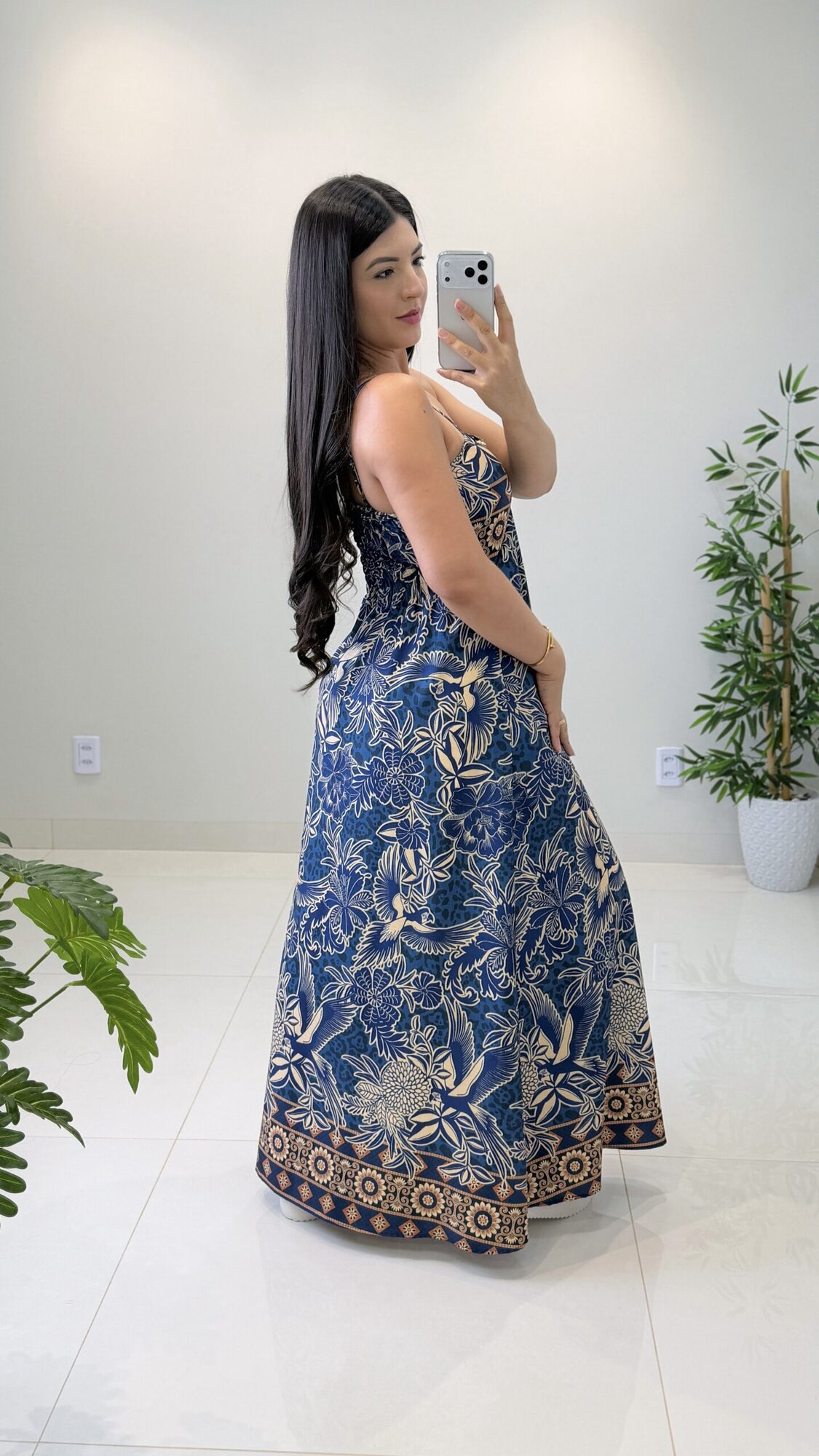 Com modelagem longa e fluida, ele traz leveza e movimento a cada passo. O decote meia taça que valoriza o colo com elegância, enquanto a estampa marcante deixa o look moderno e sofisticado na medida certa.