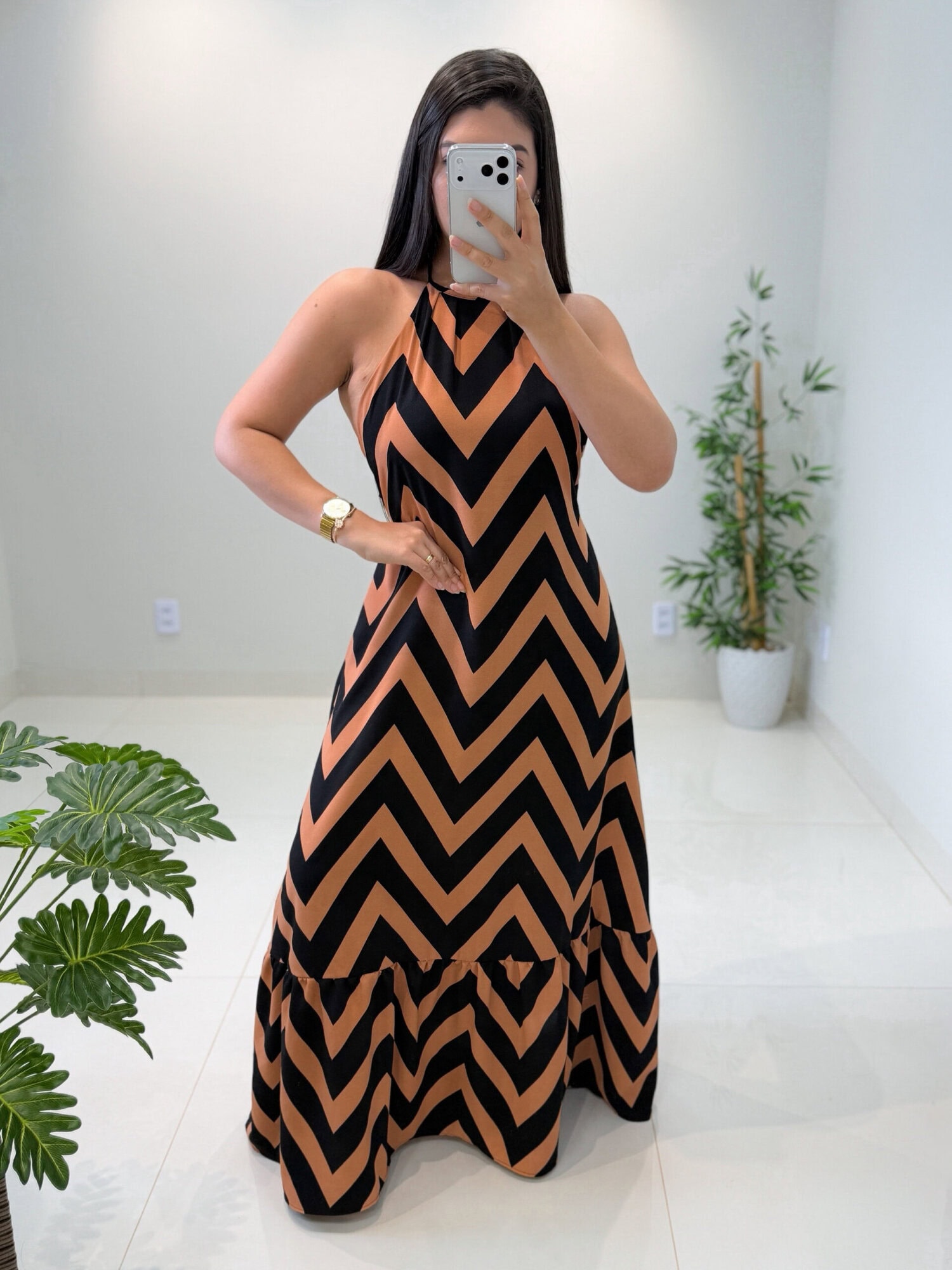 Com modelagem longa e fluida, ele traz leveza e movimento a cada passo. O decote drapeado valoriza o colo com elegância, enquanto a estampa marcante deixa o look moderno e sofisticado na medida certa.
